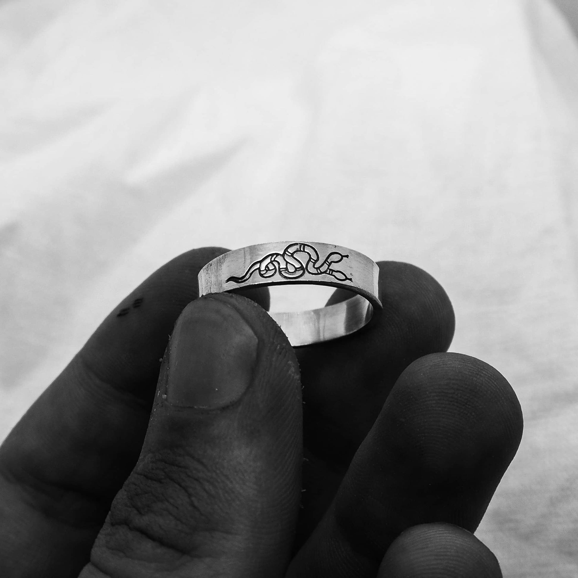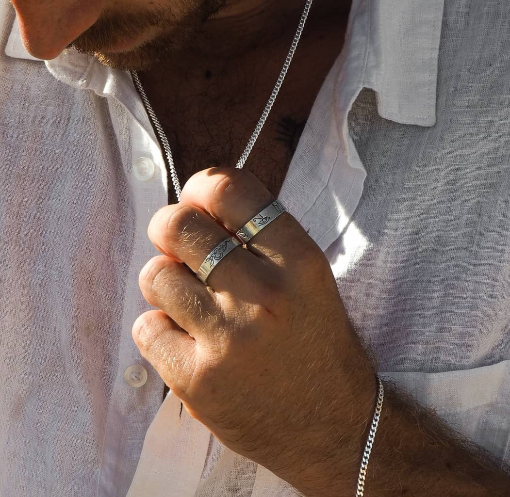 Each ring is hand-made entirely from solid Sterling Silver 925 (water, sweat and rust-proof) giving you the peace of mind to wear it anywhere. The use of solid materials is especially important to us for rings given the heavy day-to-day wear they are exposed to and the speed at which cheaper alternatives fade, flake and break.