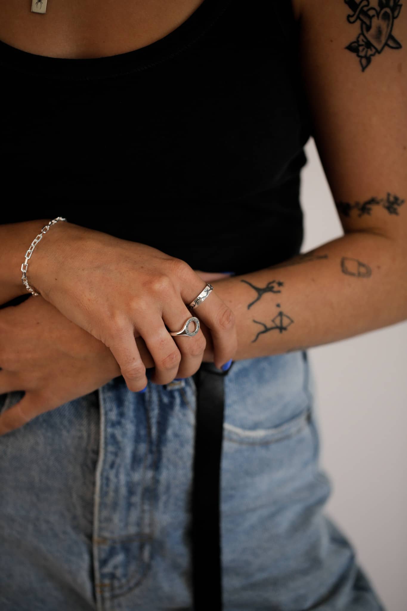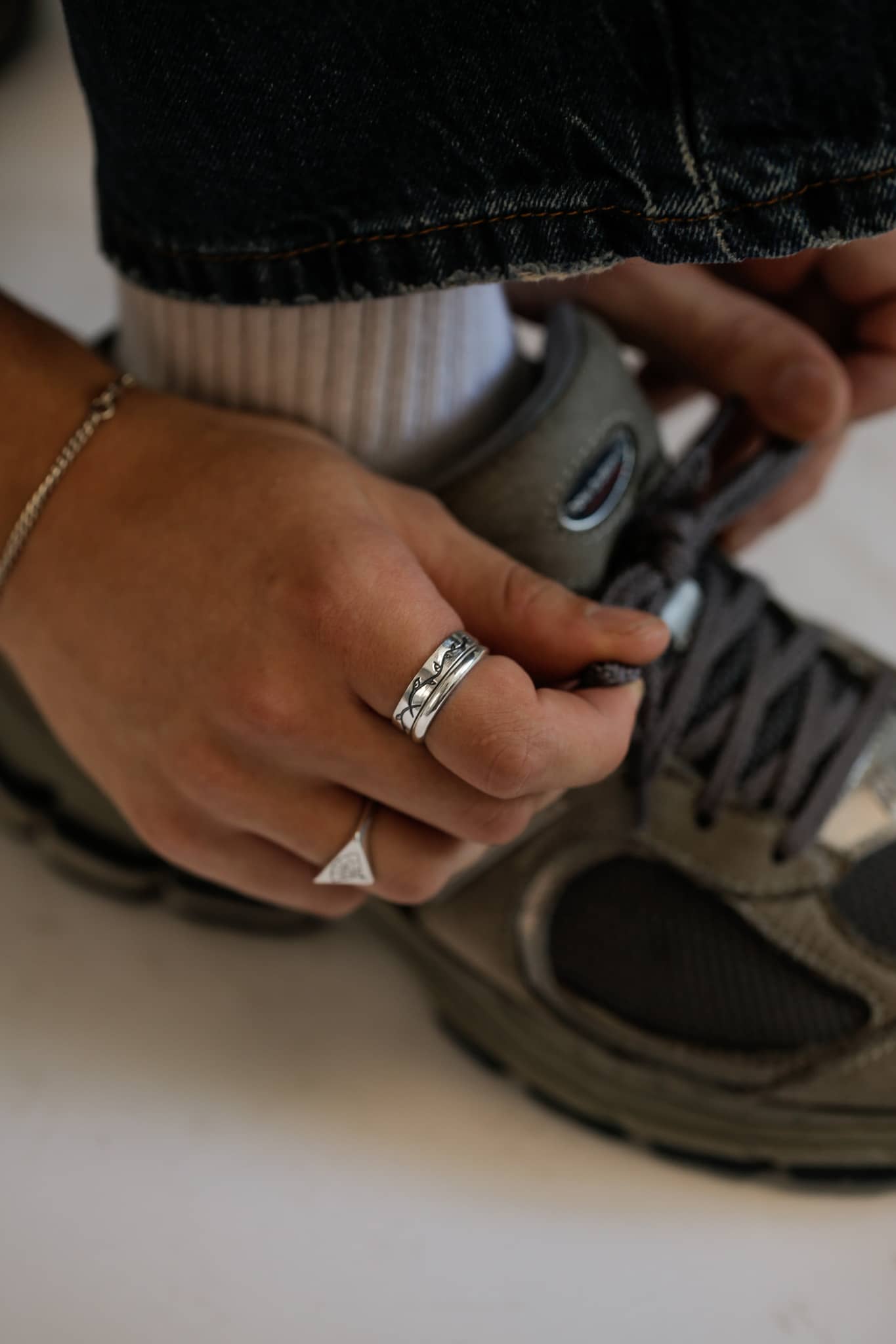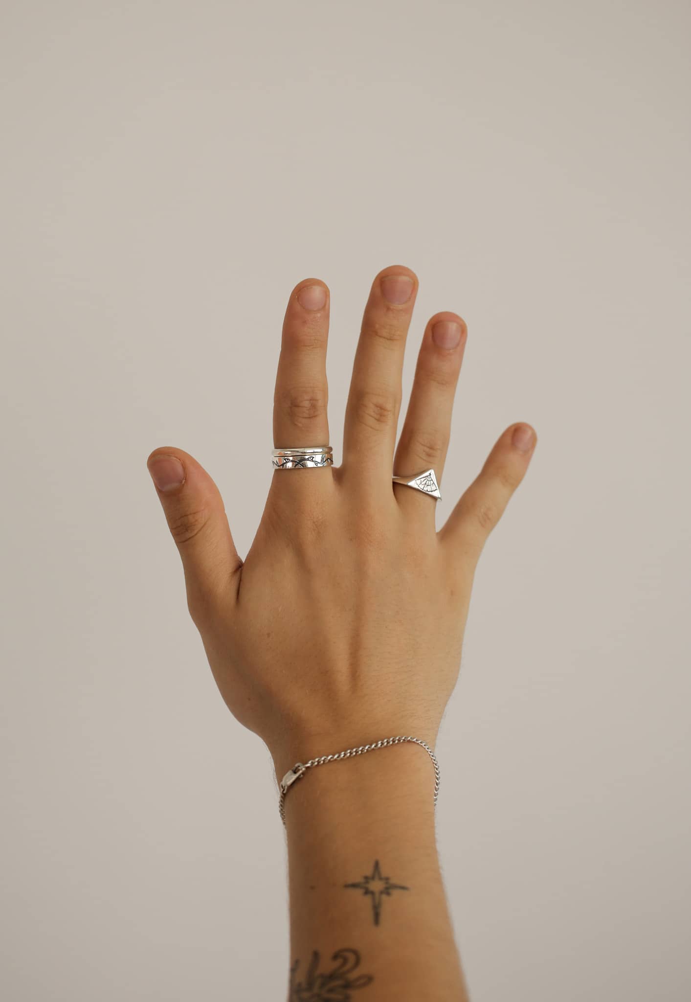 Each ring is hand-made entirely from solid Sterling Silver 925 (water, sweat and rust-proof) giving you the peace of mind to wear it anywhere. The use of solid materials is especially important to us for rings given the heavy day-to-day wear they are exposed to and the speed at which cheaper alternatives fade, flake and break.