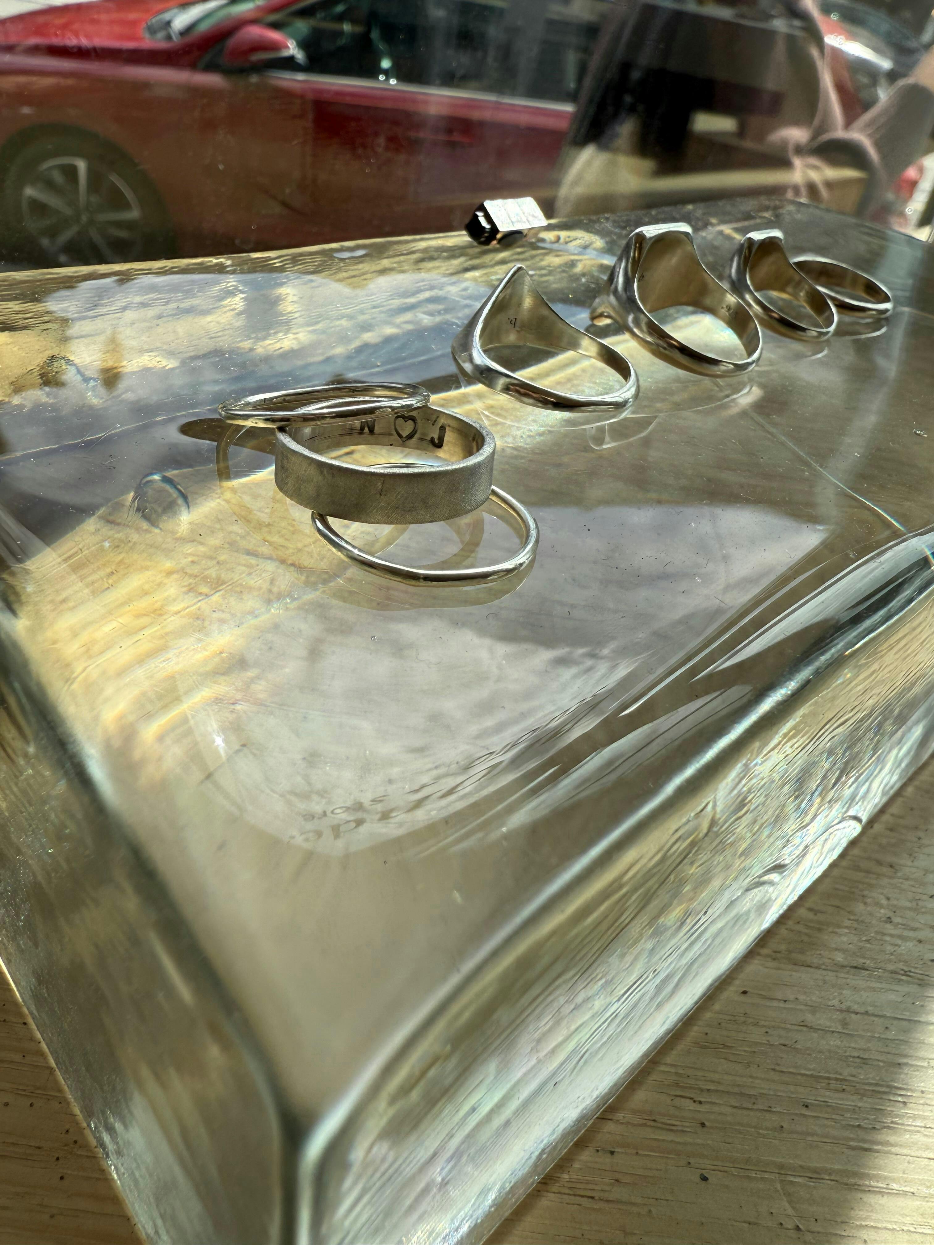 - Second Ring: A more advanced custom design - choose your own shape, texture and finish - and personalise your ring with lettering or numbers on the inside or outside. See some of our students' examples in our reviews below! If you’re purchasing a gold ticket, the cost of the first solid gold ring is included in the ticket price and the material used in the second ring is paid for (by weight) on the day of your class depending on your selections.