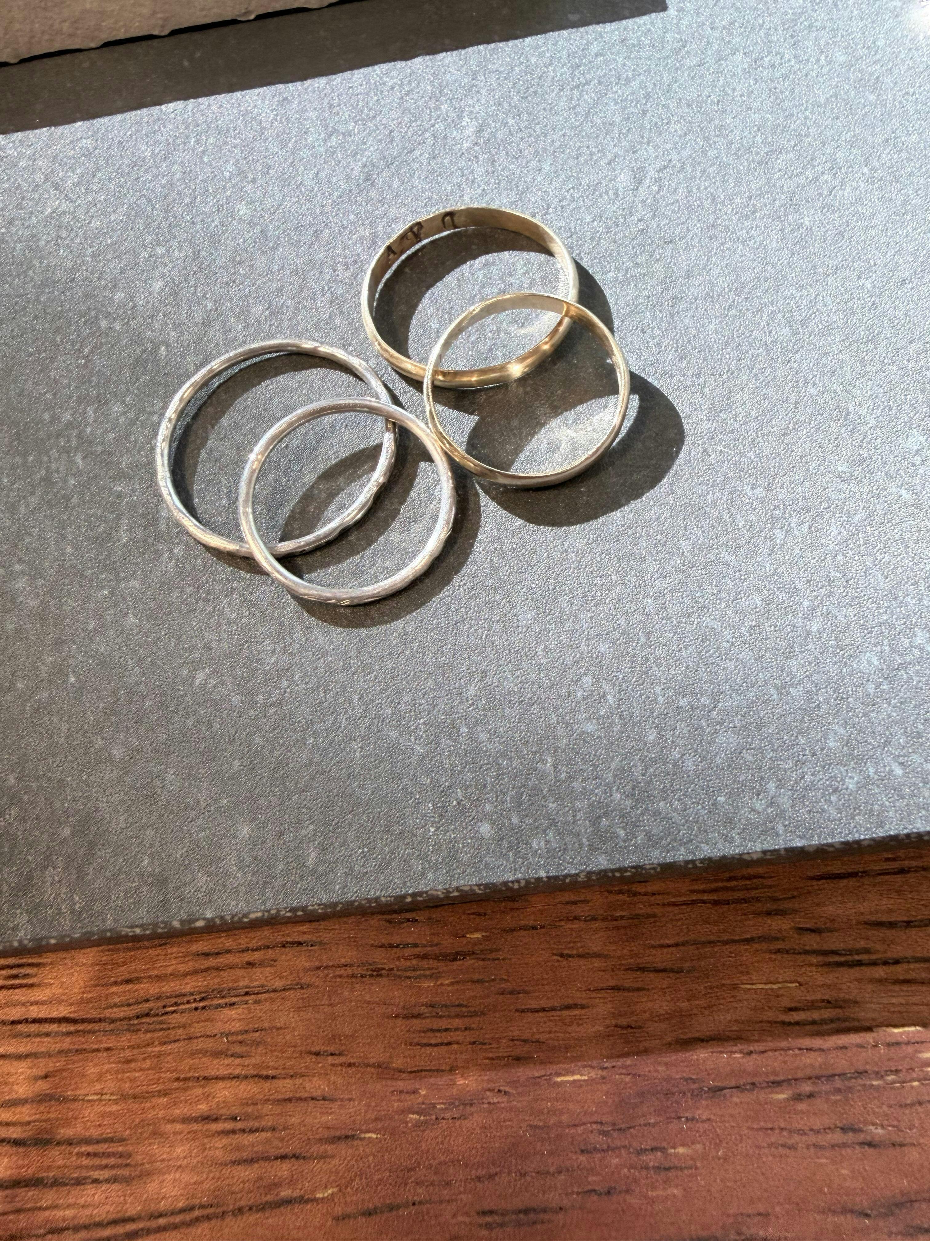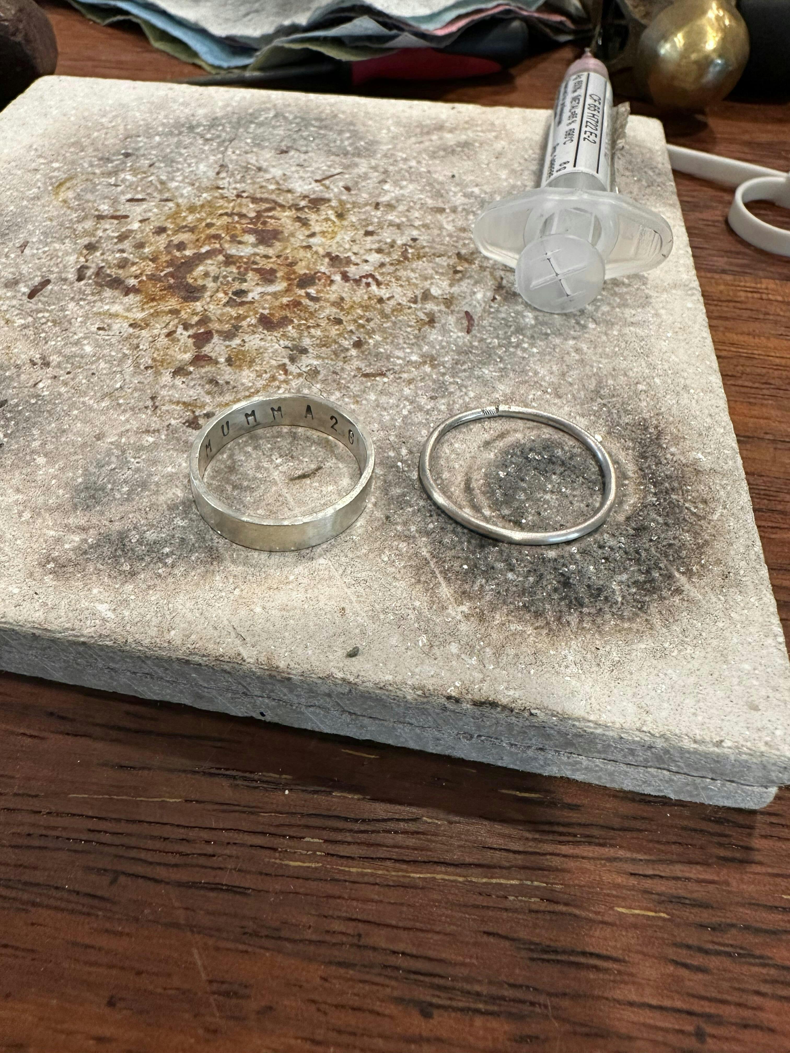 - Second Ring: A more advanced custom design - choose your own shape, texture and finish - and personalise your ring with lettering or numbers on the inside or outside. See some of our students' examples in our reviews below! If you’re purchasing a gold ticket, the cost of the first solid gold ring is included in the ticket price and the material used in the second ring is paid for (by weight) on the day of your class depending on your selections.