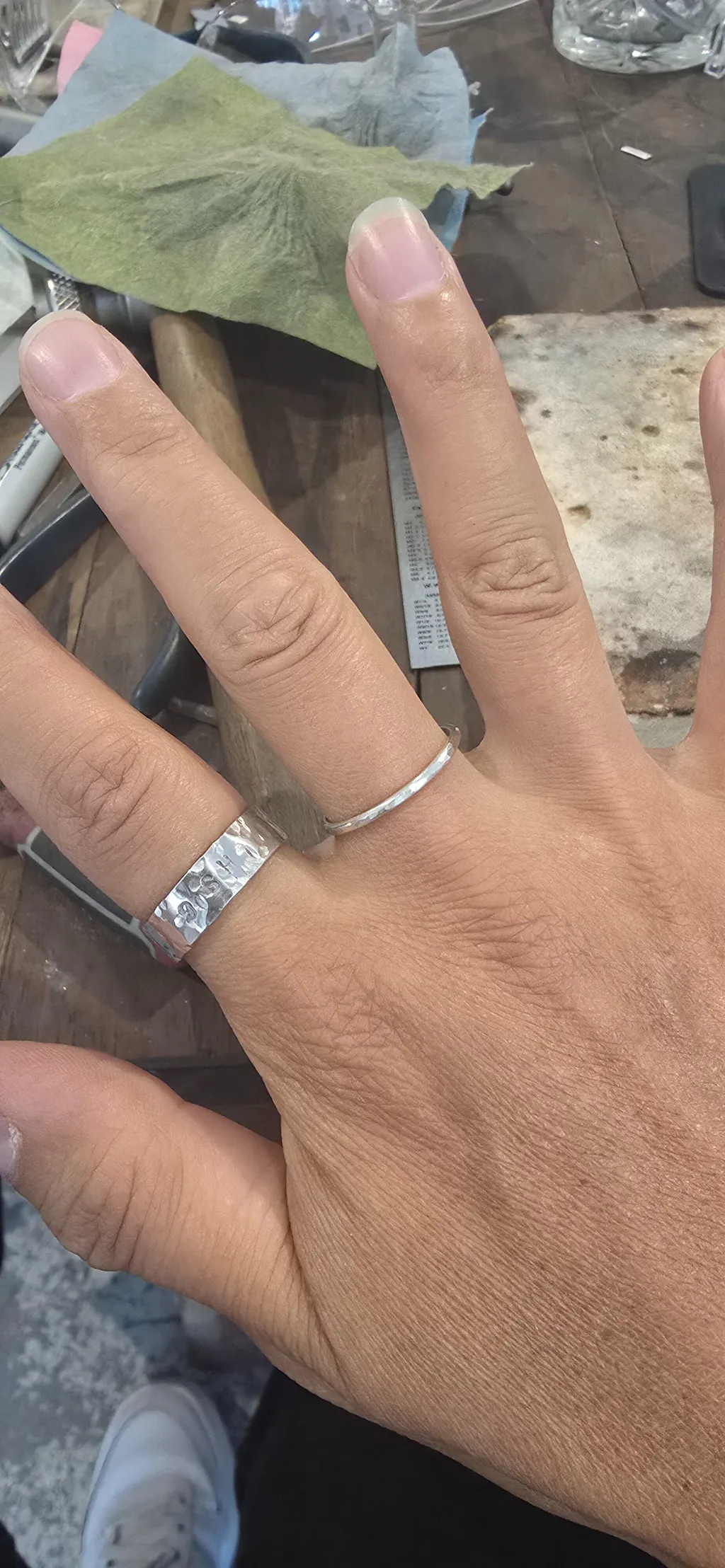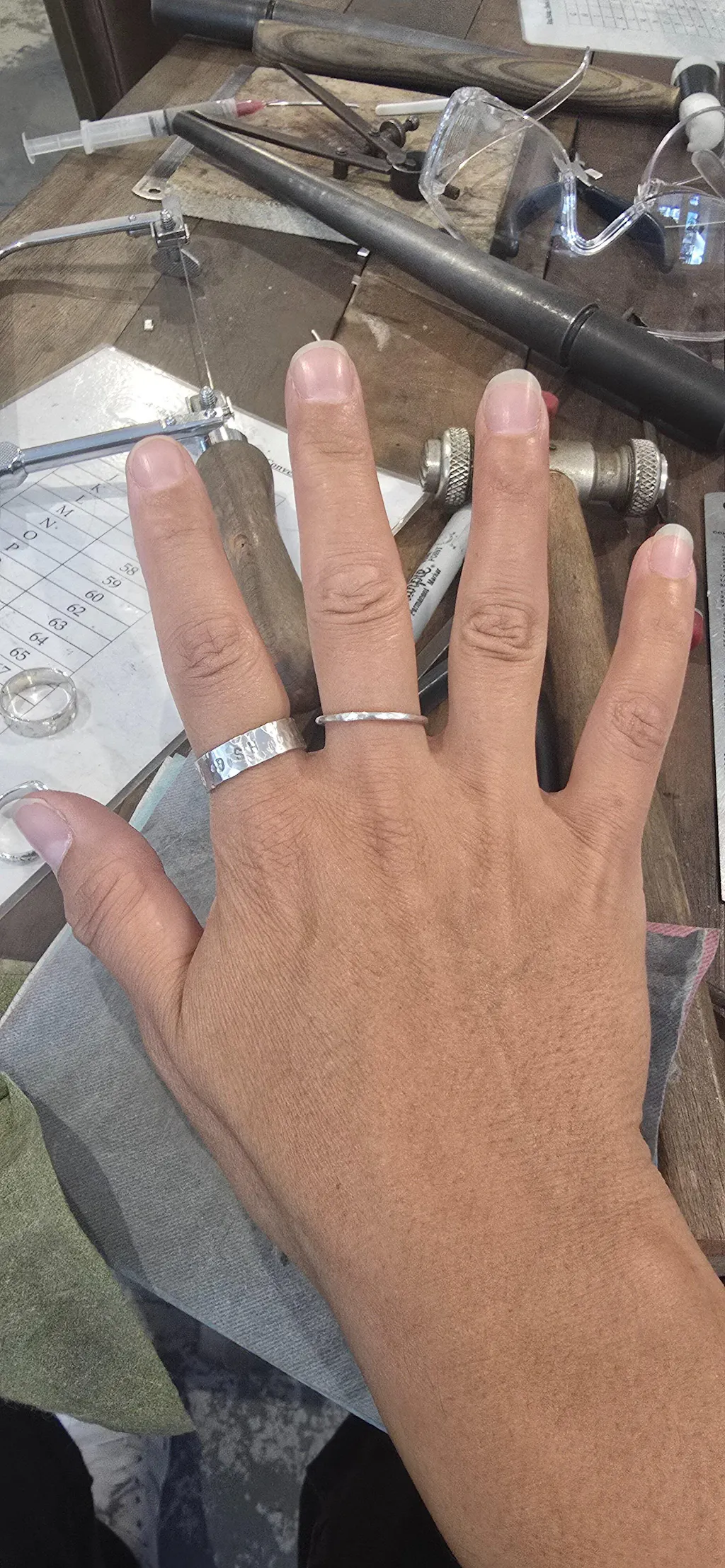- First Ring: A stacker band completed step by step together - designed intentionally to ease you into the tools and techniques you’ll need for ringmaking. If you choose to upgrade your first ring to gold, the cost is $200 paid on the day of your class.