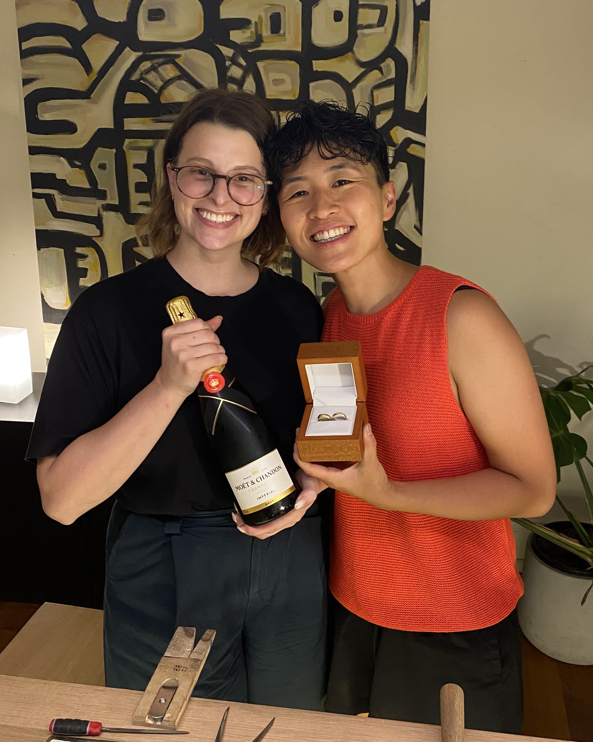 During the two hour class, you’ll learn traditional metal-smithing techniques and ring-making fundamentals from one of our mentor jewellers; such as sawing, annealing, soldering, filing and polishing in an intimate, one-on-one session. The class is perfect for beginners - our experienced instructors will guide you through each step of the process, ensuring you leave with beautiful, customised rings that fit your fingers and suit your style seamlessly. Couples are often concerned about the quality of the finished bands they’re capable of, but fear not! We’ll ease you into the basics by running through a practice ring together in silver, before moving onto the wedding bands. Your instructor will be there every step of the way to fix issues and apply finishing touches - ensuring the final bands are nothing short of perfect.